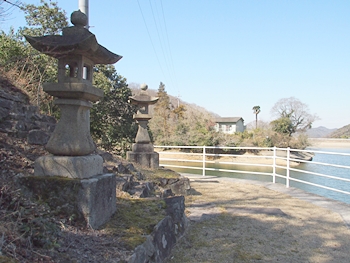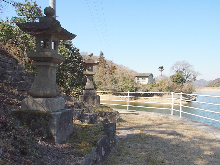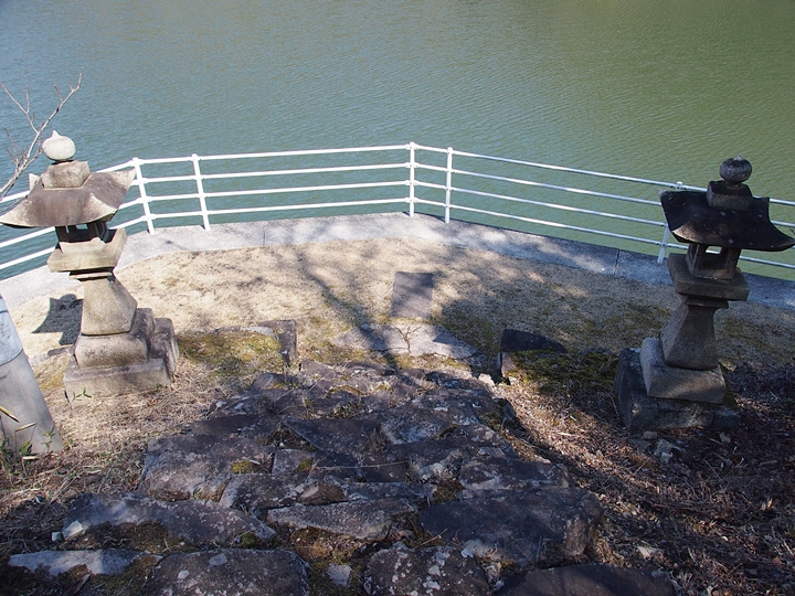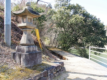 石段を下りきりますと両側に石灯籠というか常夜灯が二つ。ここを右に進んで行きますと、フェンスで遮断され進入禁止。仕方なく、左に進んで行きます事に(^-^)