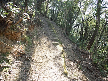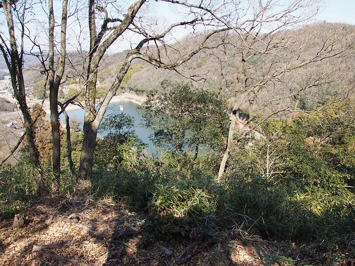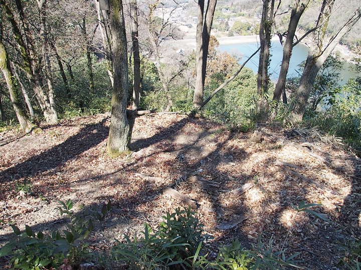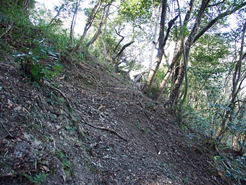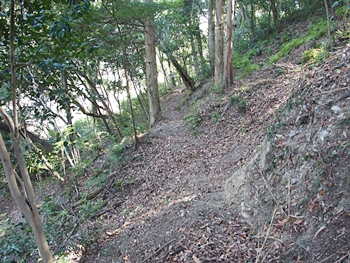 一乗山城は熊野ダム(水源地)の南に聳える標高190m程の山に築かれている。現在は主郭まで遊歩道が整備されている。
