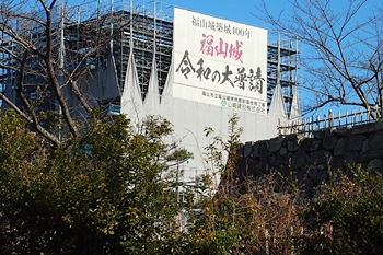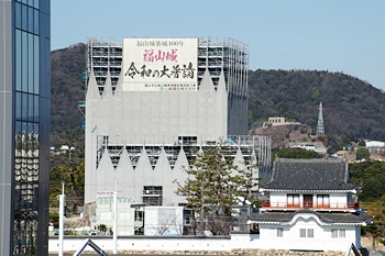 福山駅方向を眺望しますと、正面に工事用シートで覆われました福山城天守が…キャスパの建物が解体され、今でこそ正面に福山城が臨めますけど、キャスパ跡に工事中の建物が完成しますと、残念ながら福山城天守は隠れてしまいますねぇ〜