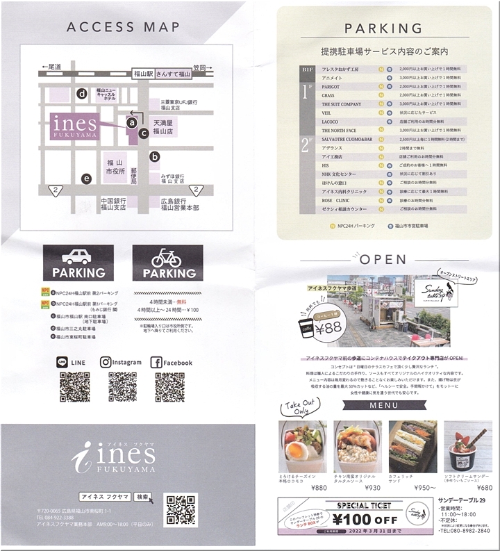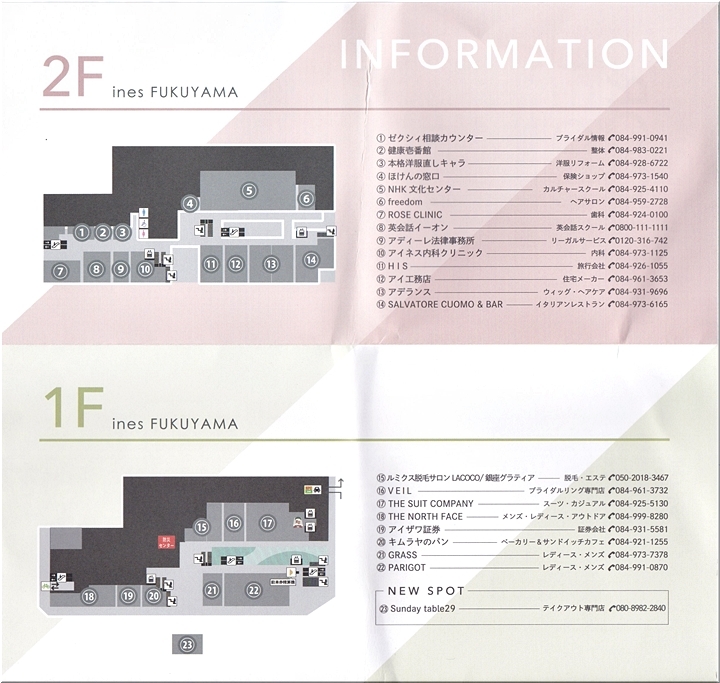 アイネス福山の1階からエスカレーターで2階に上がりますとパンフレットが…これに眼を通しますと、ふ〜ん、屋上庭園は「シバノパーク」と言うようですネ。
