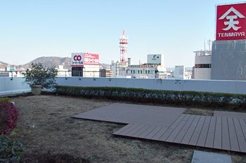 エスカレーターでは行けませんが、エレベーターに乗る事で屋上に行けます。屋上部分は屋上庭園になっていて、福山駅前が一望出来ます。