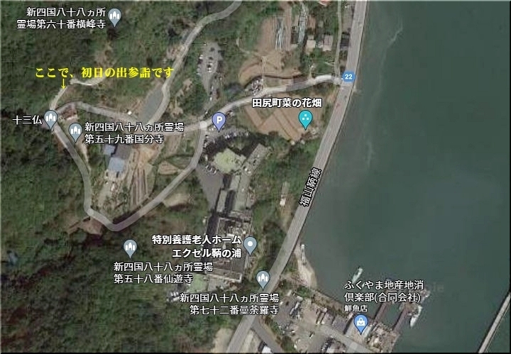初日の出を見よう…と、護岸沿いにズラッと車が駐車です。片側一車線の、そんなに広い道でもありませんから、対向車がヤッて来ますと、鞆方面に向かいます車は駐まるか徐行で対向車が優先です。こんな事情でノロノロ走行が発生のようですねぇ〜