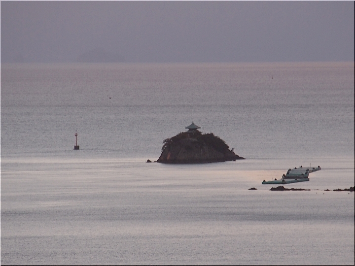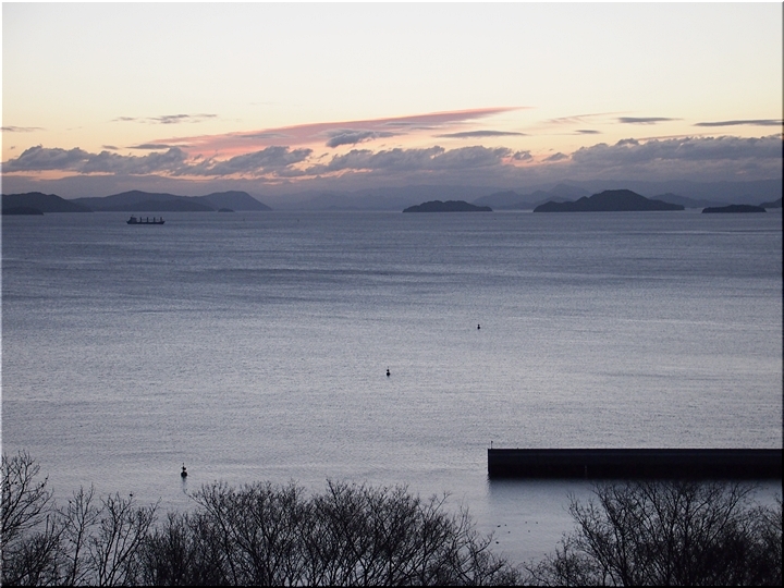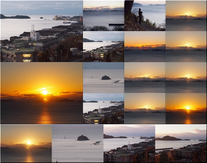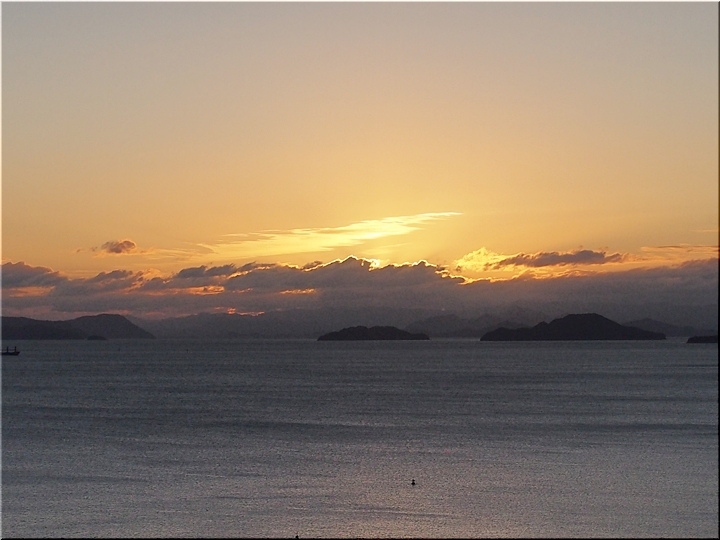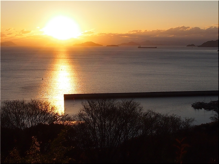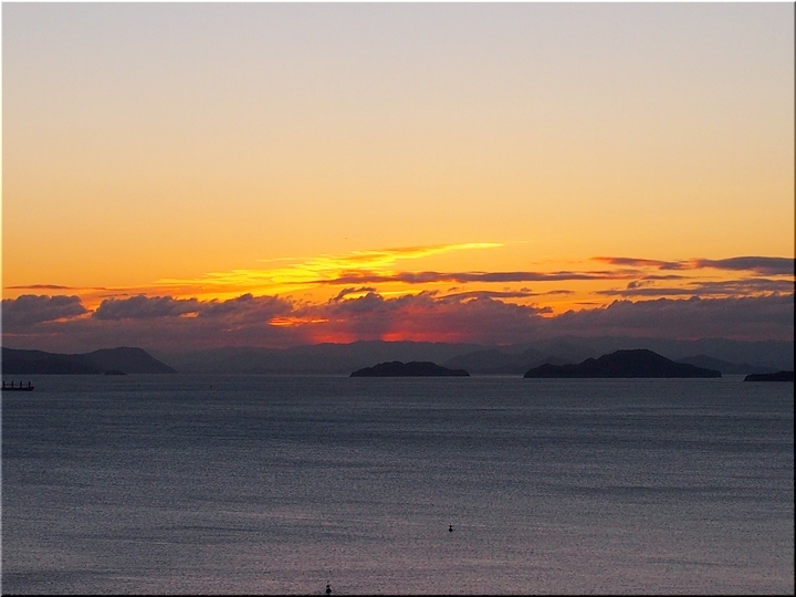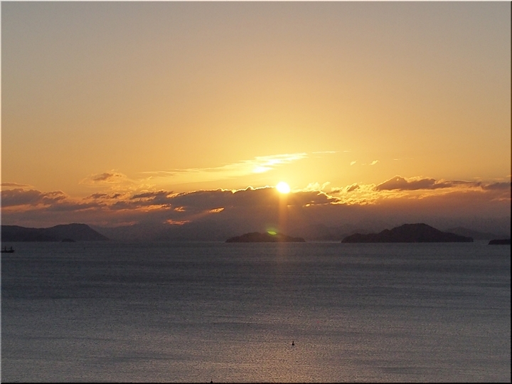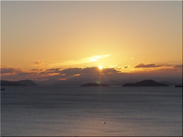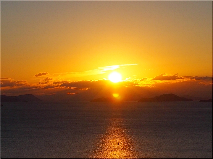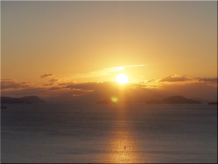 日の出方向の島は、北木島なんでしょうネ。そして、その左側が白石島なんだと思います。違うかも…