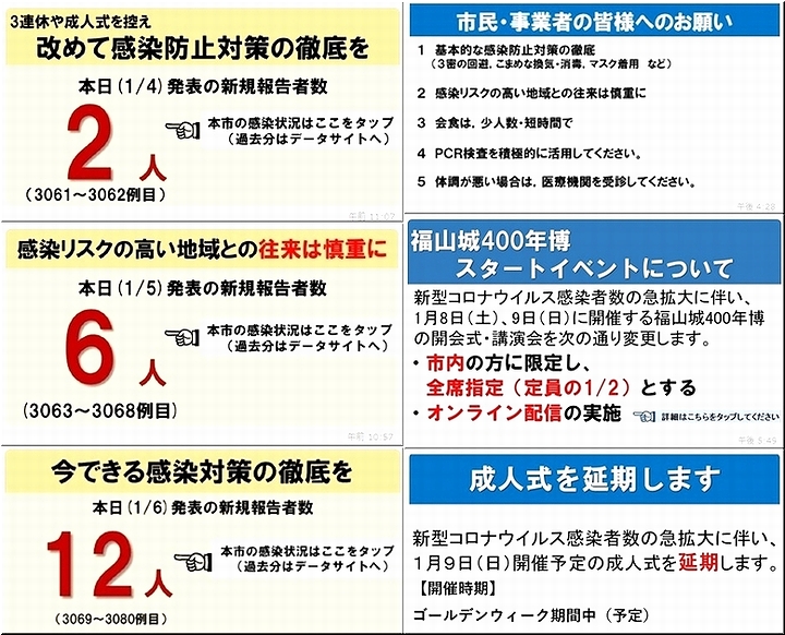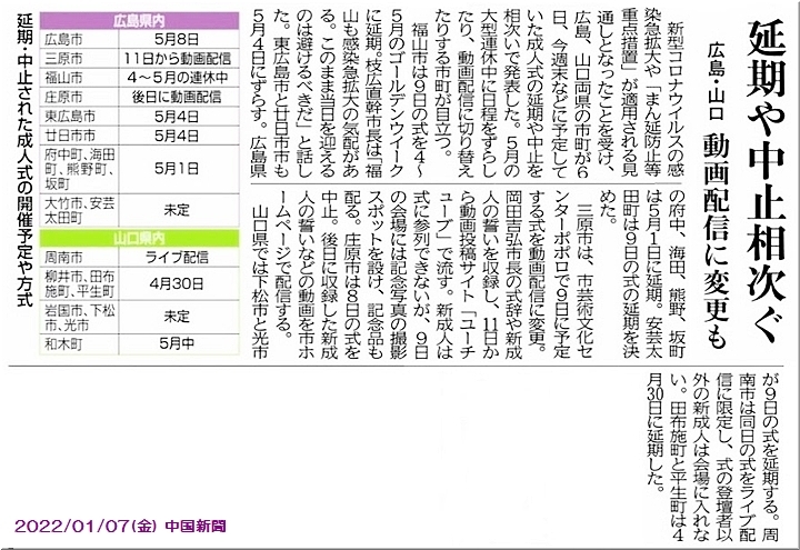 年が明けまして、福山市も、1/4--2名・1/5--6名・1/6--12名…と、感染者が発生して来ておりまして、「福山市消防出初め式」「福山城400年博」「成人式」…の諸行事が、規模縮小・延期の方向にありますようですねぇ〜