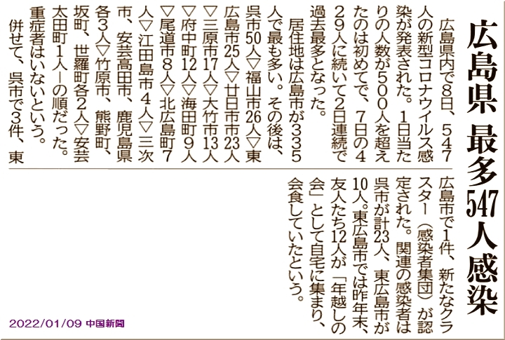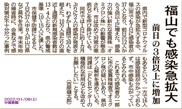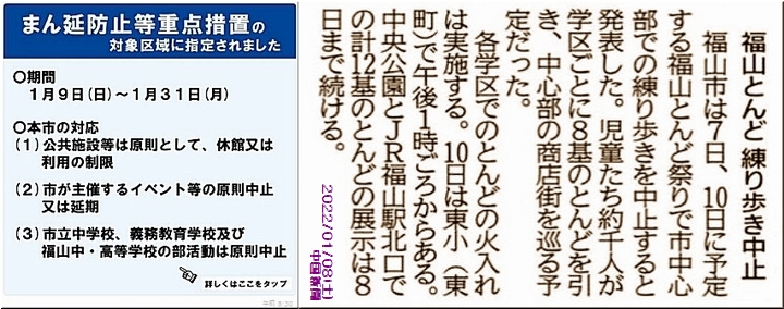 年明けと共にコロナ感染者が福山市でも急拡大の状況ですから、「まん延防止等重点措置」適用は、やむを得ませんネ。