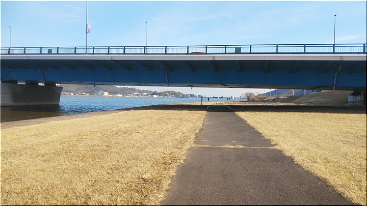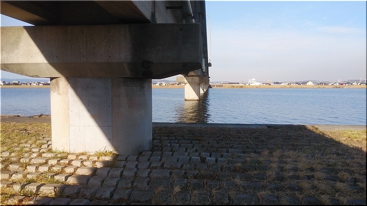 芦田川大橋を潜りますと、小水呑橋方向をパチリ。後方を振り返り河口堰方向を、またパチリ。