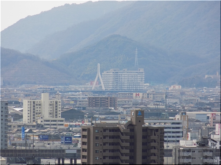 ズームを効かせて芦田川大橋も…斜張橋の主塔・エクセル・ハローズ…辺りがどぅにか撮れましたネ(^-^)