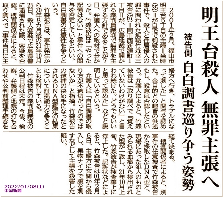 これは、1/8(土)の中国新聞sanの朝刊記事なんですけど、ふ〜ん、明王台主婦殺人事件の容疑者…一転、容疑を否認ですか…