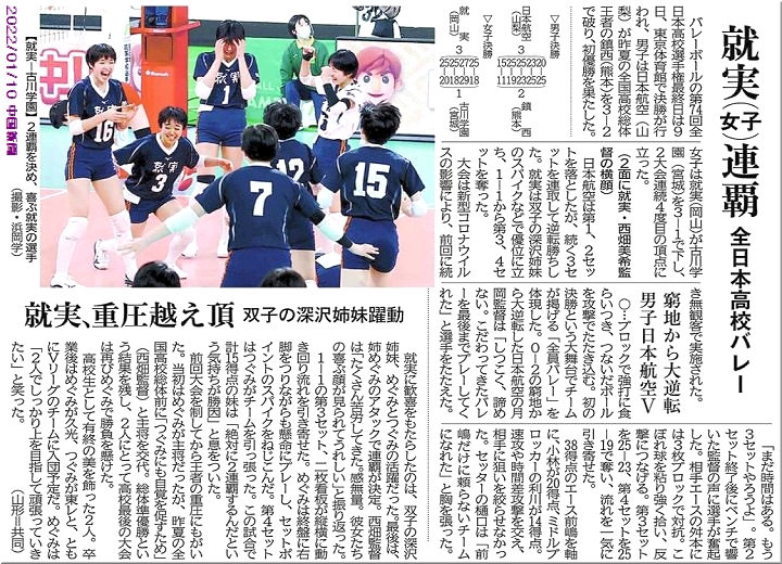 第74回全日本高校バレーボール選手権の決勝戦が、昨日(1/9)に行われ、女子は岡山県の就実高校が2大会連続の4度目の頂点に立ちましたようであります(^_^)v
