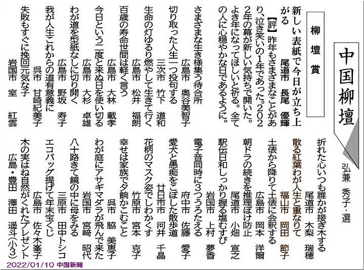 これも、今朝の中国新聞sanの朝刊に掲載がありましたけど、ふ〜ん、「中国柳壇」に、また従姉の作品が…