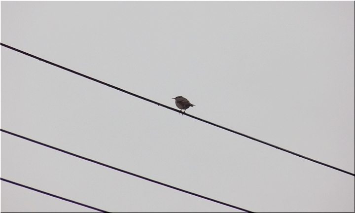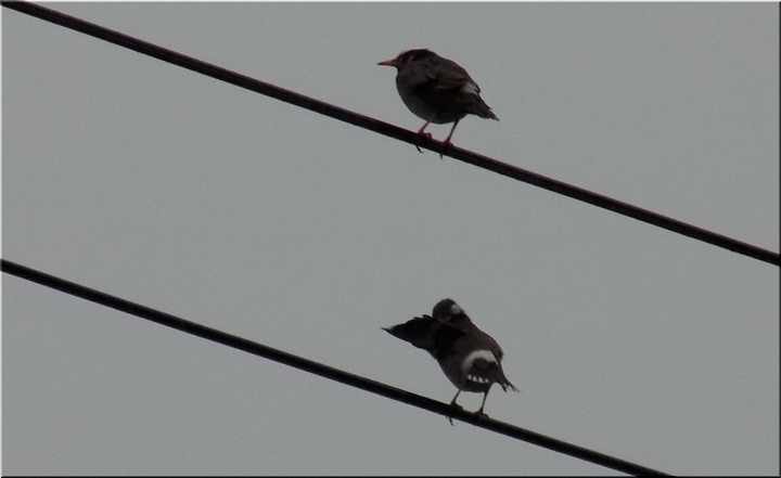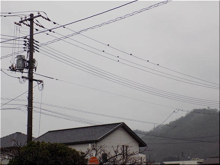 一服しながら、西南の空を見上げますと、電線上に沢山の鳥が…こんな降雨の中で、何でまた、集団で電線上に…寒いし、冷たいし、ズブ濡れになるのに…どぅして樹木の中に潜り込み雨宿りしないのだろう…と、チト不思議。
