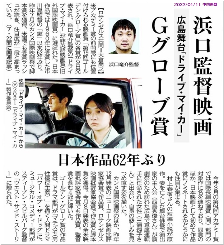 今朝の中国新聞san朝刊の1面に『浜口監督映画 広島舞台「ドライブ・マイ・カー」Gグローブ賞』の記事掲載が…