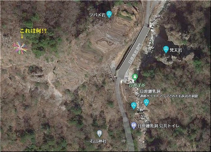 東京都奥多摩町の山奥を撮影した衛星写真に赤・緑・青などのカラフルな放射状の謎の物体が写っていた光景。