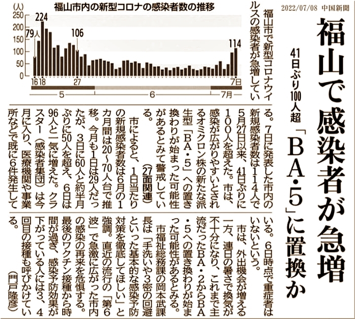 こんな現状から、7/8(金)付け中国新聞san朝刊で「福山市のコロナ感染者急増」を取り上げておられました。