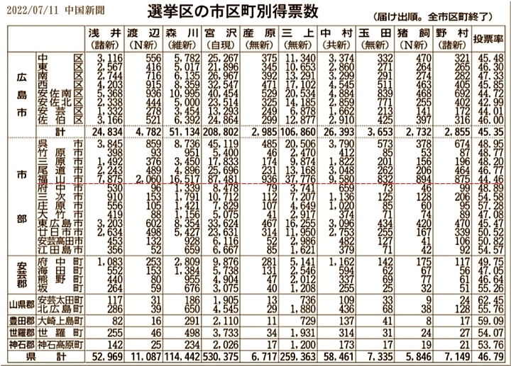 中国新聞sanの朝刊記事によりますと、参院選広島選挙区の投票率は46・79%で、2019年の前回選の44・67%を2・12ポイント上回ったようであります。