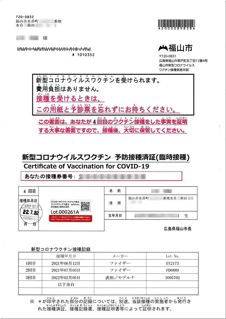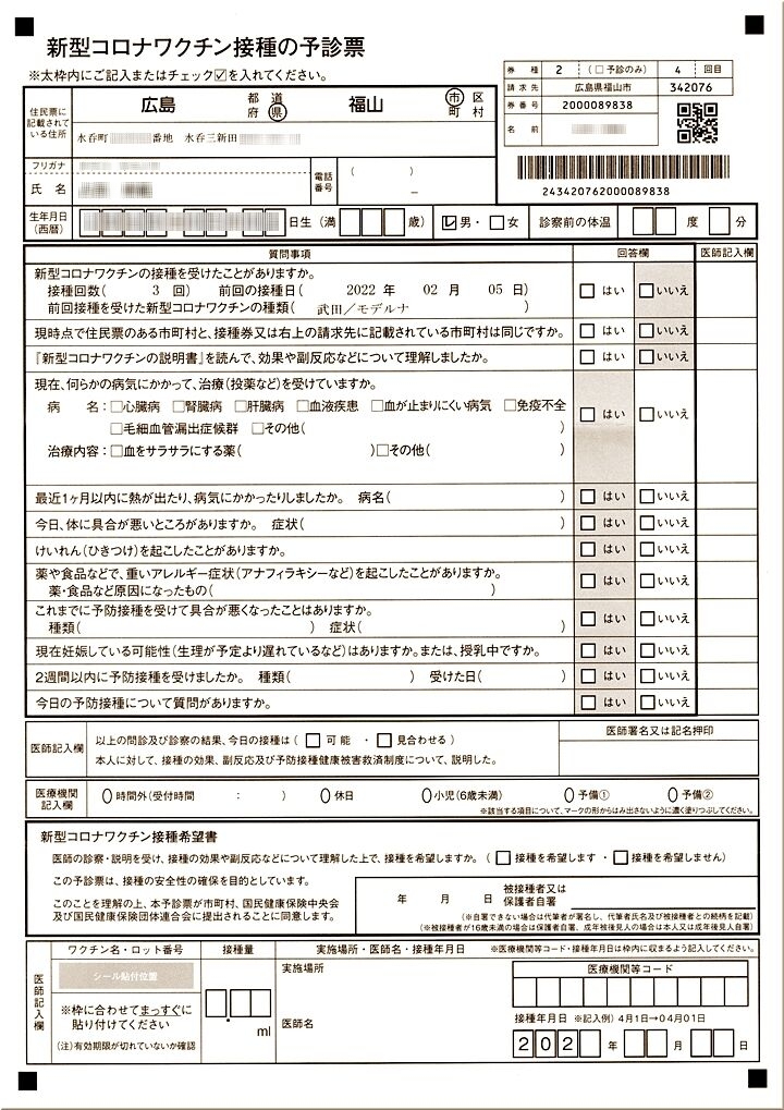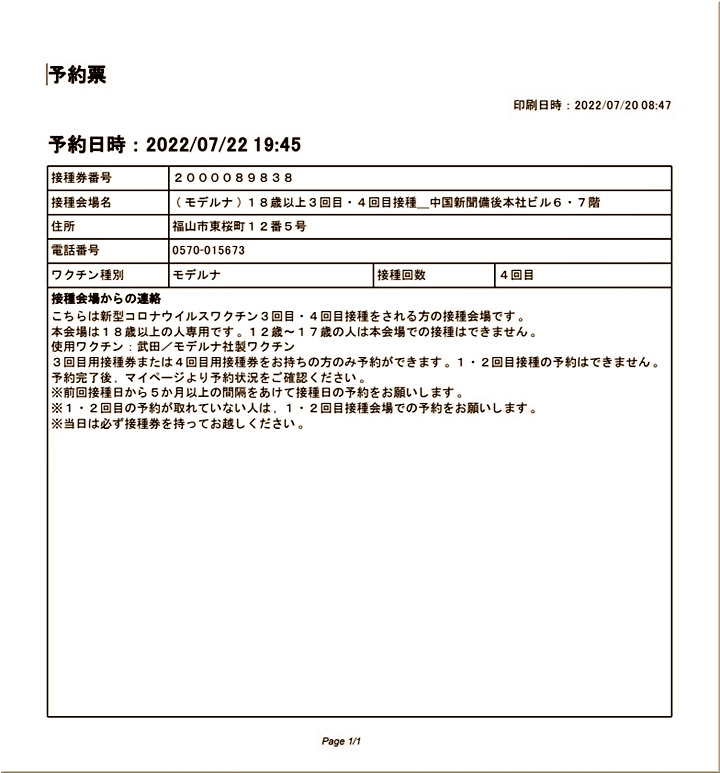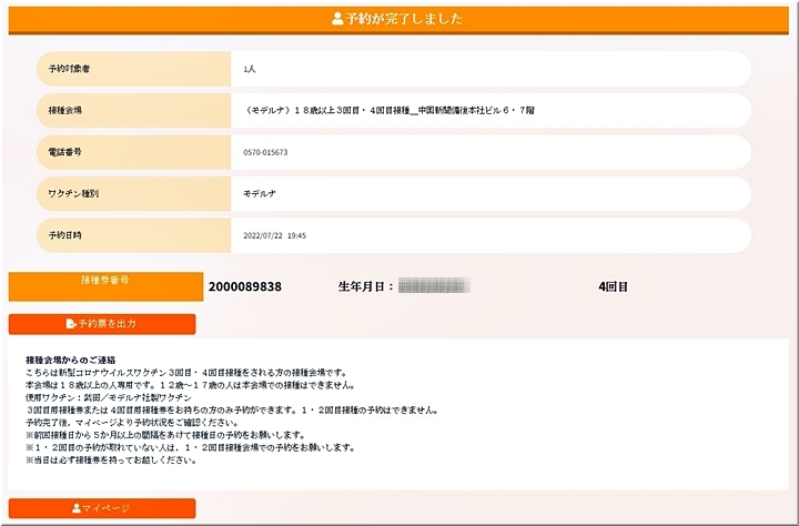 ・予約者(接種券番号 生月日 回数):2000089838様 05/02 4回目