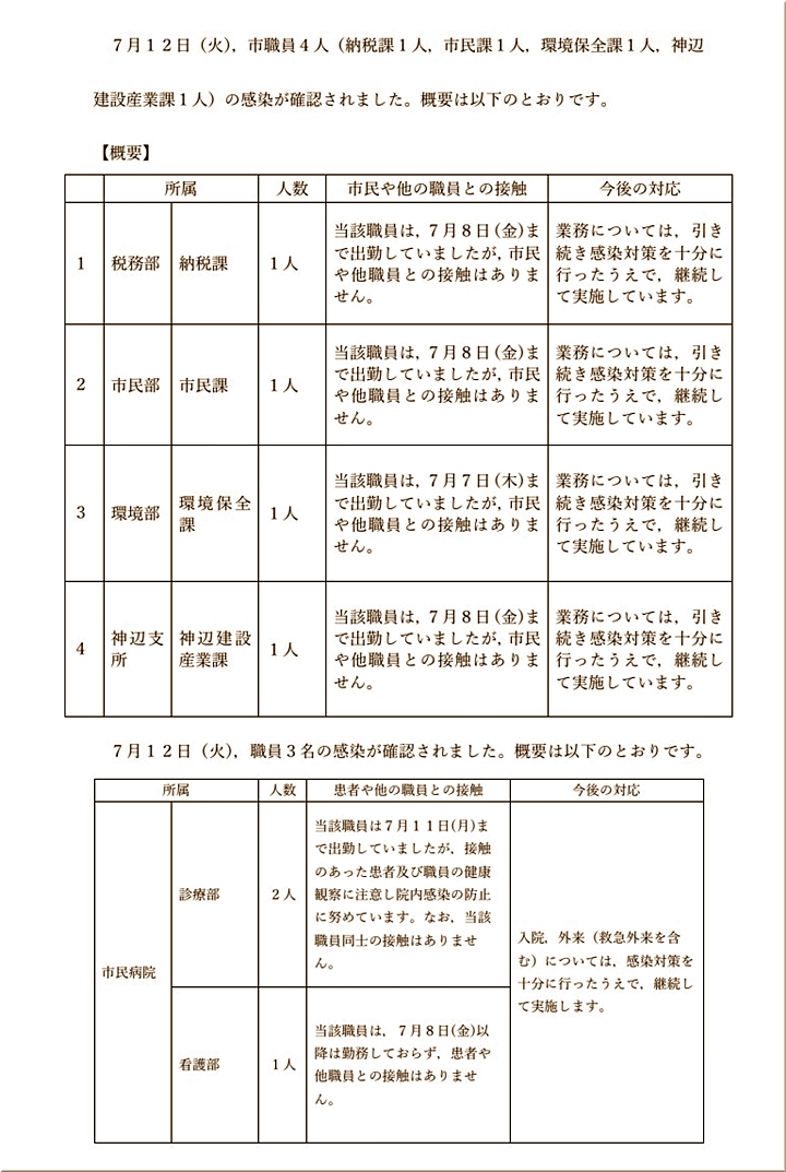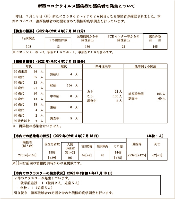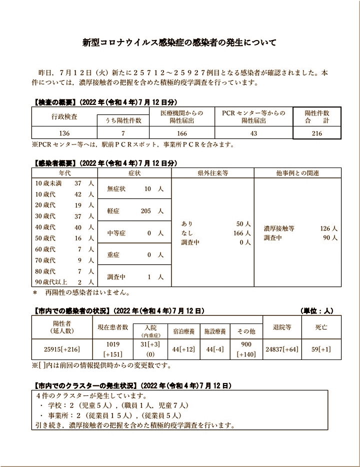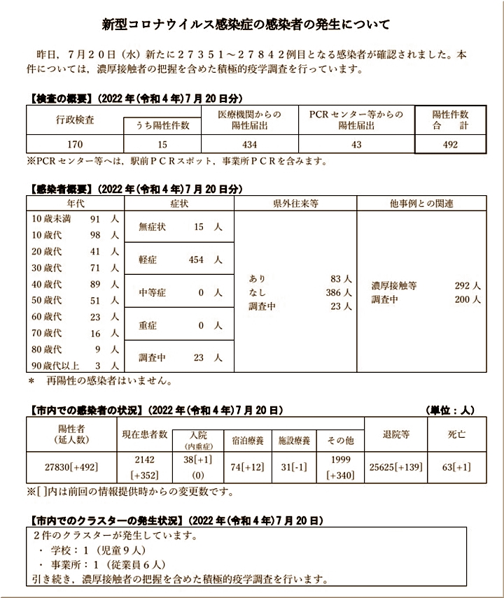 市内で発生した新型コロナウイルス感染症の感染について、ゲノム解析を実施した結果、7月20日付で新型コロナウイルス感染症(オミクロン株「BA.5」)が1件確認されました。