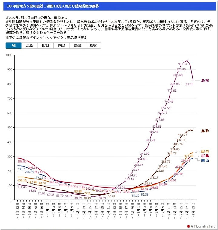 中国5件を見てみますと、島根県西部でもコロナ感染急拡大で、県内2日連続1,000人超え、益田の医療逼迫の兆しもあるようです。