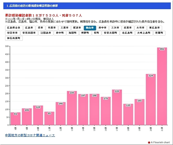 福山市の発表では、昨日、新たなコロナ感染者発生が「492人」でしたから、今日あたり「500人」越えなのかも…と危惧しておりましたけど、本日の発表では「362人」でありました。