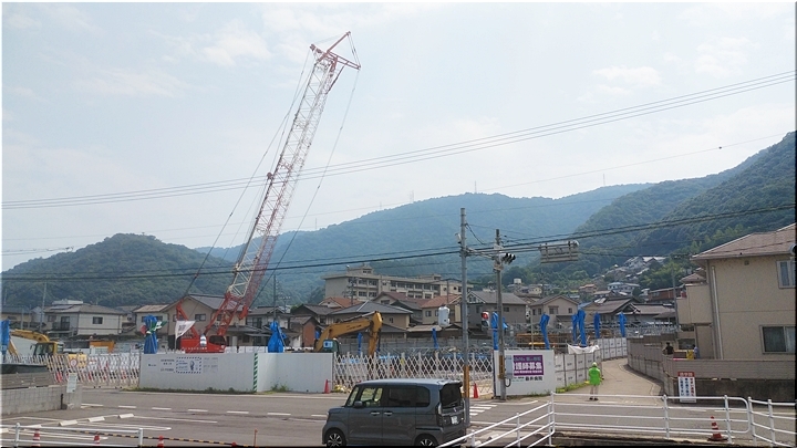 長いクレーンも折りたたまれ休止状態で、工事車両の出入り口も閉ざされて…構内に人影は見当たりません。