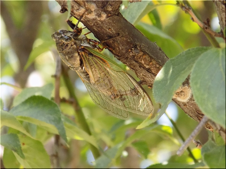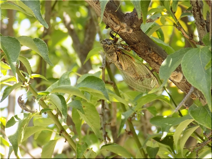 何処にいるのだろう…と見つめてみますと、うん、うん、おりましたネ。これは、鳴き声からしてクマゼミのようですねぇ〜