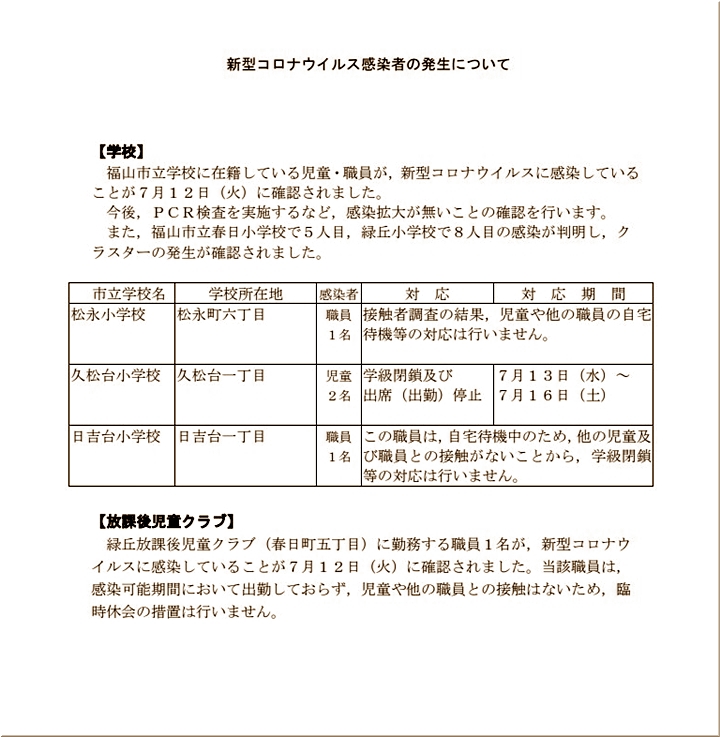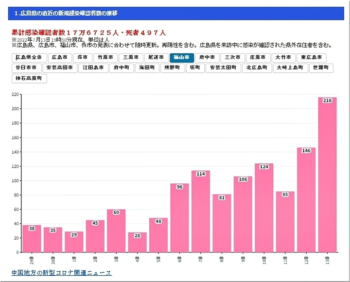 ◆広島県福山市で216人感染、1人死亡 小学校などクラスター4件 13日新型コロナ