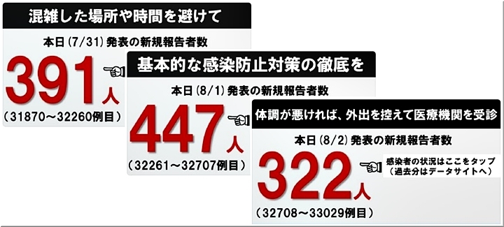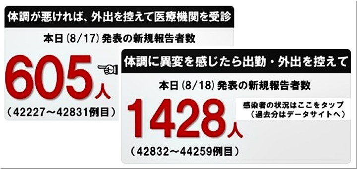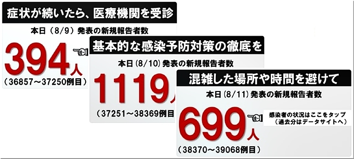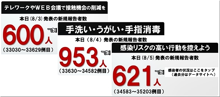 8/3・600人、8/4・953人、8/5・621人…と、これで3日連続の600人越えですから、何と言いましたら宜しいのでしょう…外出しますのが、恐く感じられてしまいます。