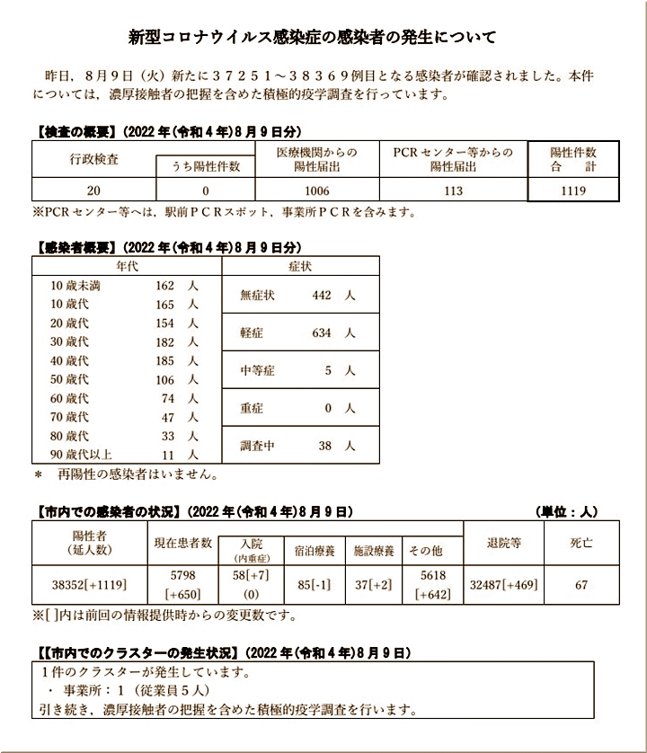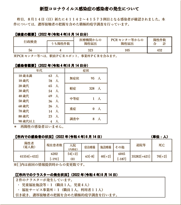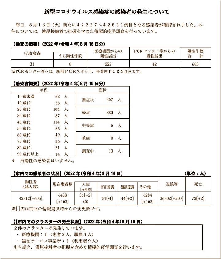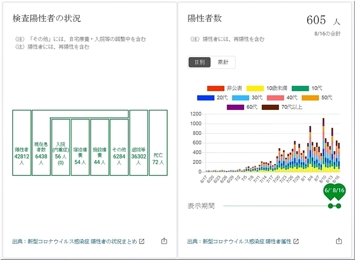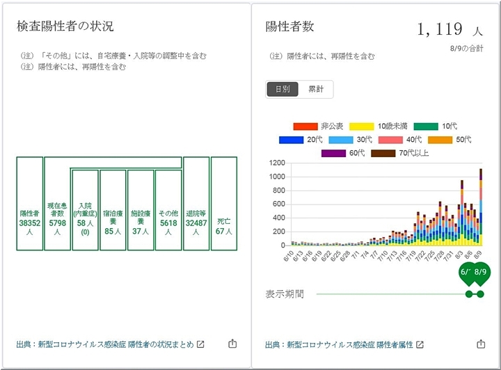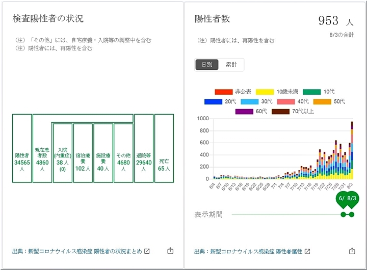 8/3の感染者のあまりの多さに、どちらかでクラスター発生なのかも…とも思いましたけど、医療機関1、事業所1、就学前施設1…と3件のクラスターのみ。
