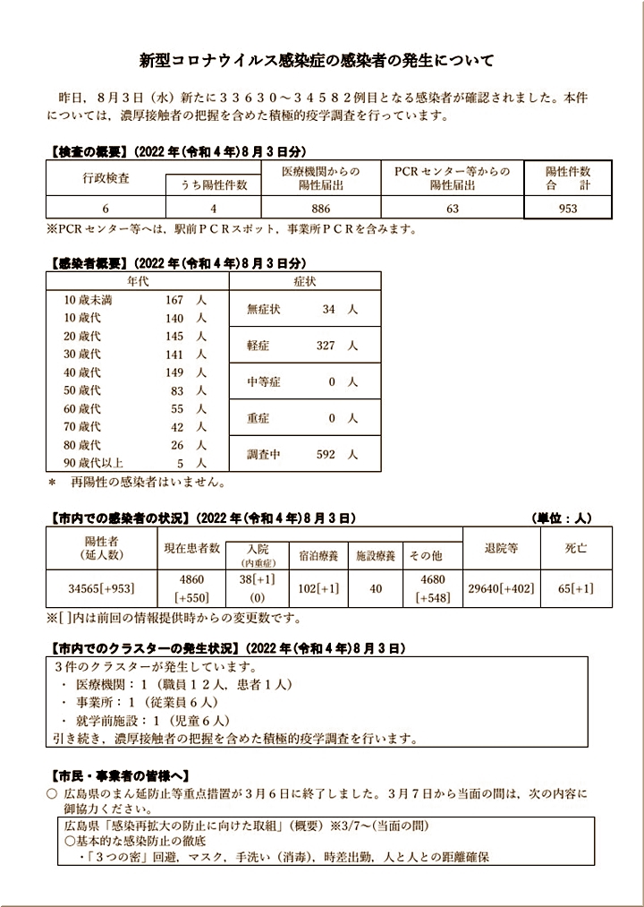 広島県内で5日、3,973人の新型コロナウイルス感染が発表された。1週間前の7月29日(2,841人)と比べて1,132人増えた。県が3人、広島市が1人の計4人の死者を公表し、県内の死者の累計は531人になった。