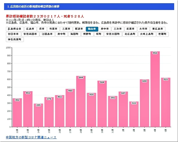 福山市の本日の発表では、新たなコロナ感染者の発生は、「621名」とか…