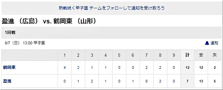 ◇7日 全国高校野球選手権大会 1回戦 盈進(広島)7―12鶴岡東(山形)