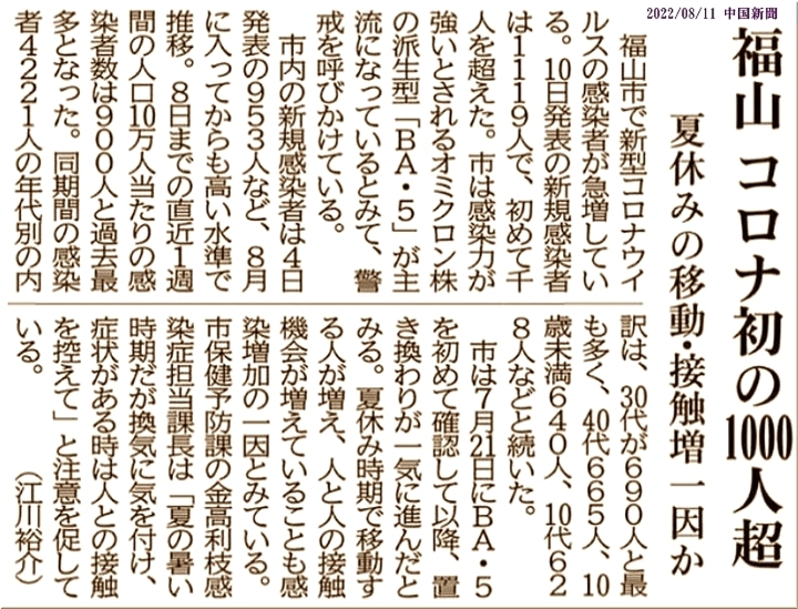 福山市の本日の発表では、新たなコロナ感染者の発生は、今月二度目の千人越えで『1,428人』でしたとか…