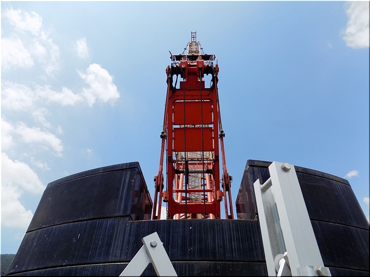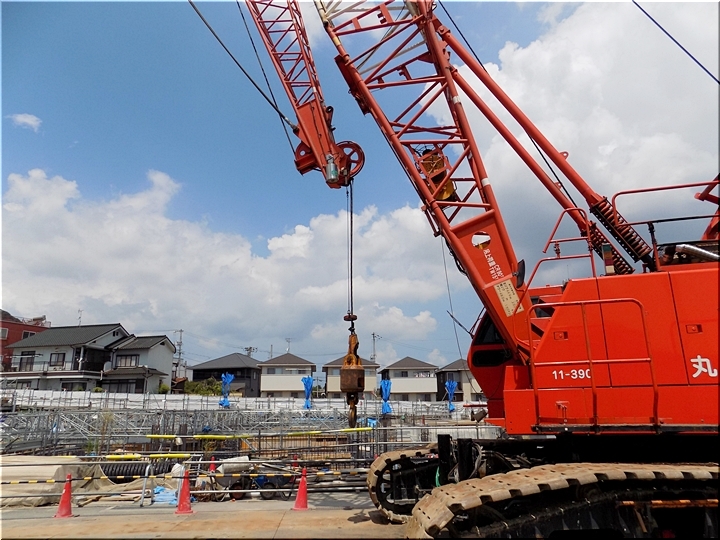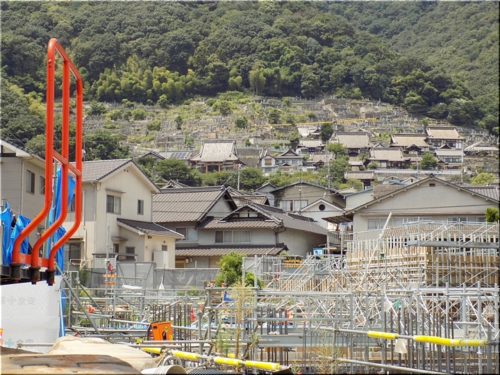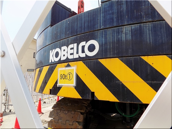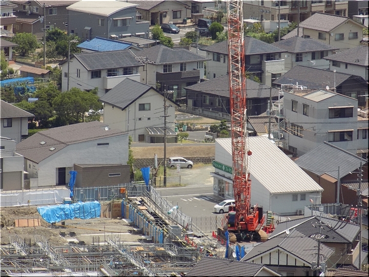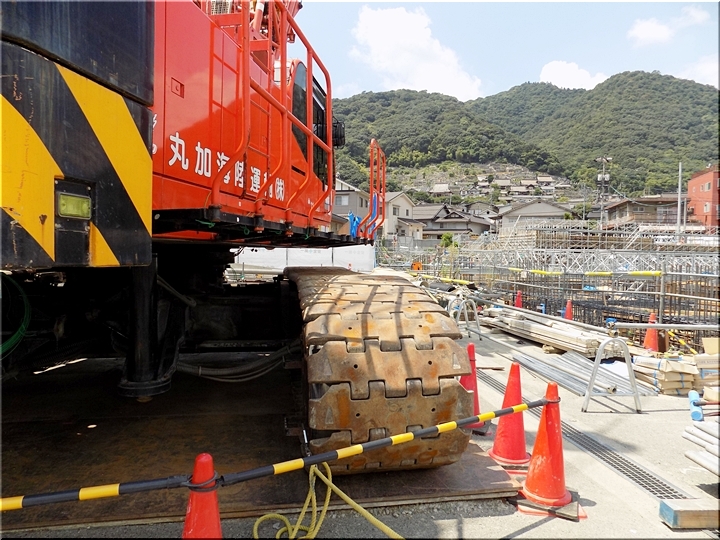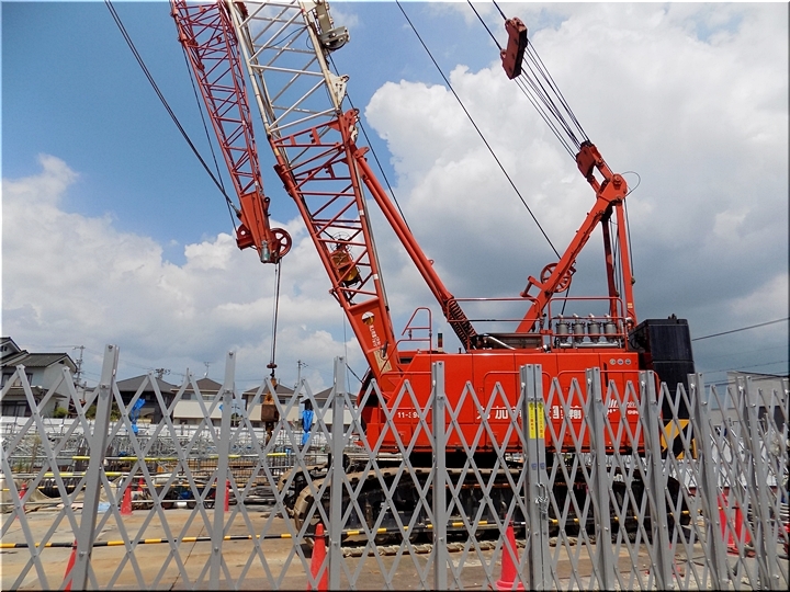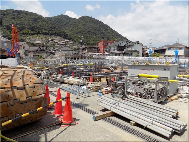 病院建設現場まで下りて来ますと、フェンス越しに建設現場を数枚パチリ。お盆ですから、当然ながら、人影はありません(^-^)