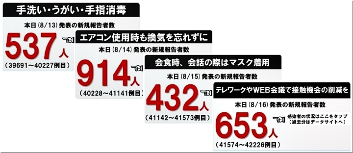 お盆休暇も終わり、明日辺りから職場復帰の方が多いのでしょうけど、気になりますのが新たなコロナ感染者の発生数。