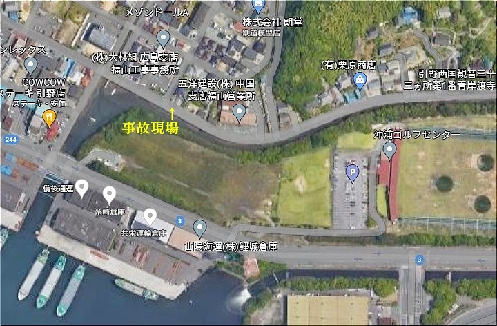 この、パトカー・救急車が駐まっています市道は、広島県道244号福山港線の北側に位置します道路なんですけど、多分、夕方の18:30頃に撮りましたような…
