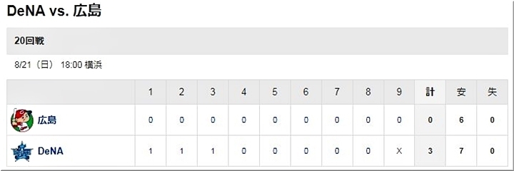 DeNAは初回、楠本のソロで幸先良く1点を先制する。続く2回裏に京山のソロ、3回には牧のソロが飛び出し、リードを広げた。投げては、先発・京山が7回途中無失点。その後は3投手の継投で完封リレーを展開し、京山は今季2勝目を挙げた。