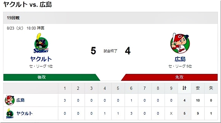 ヤクルト・村上の3ランで逆転負けのカープ…う〜ん、5連敗ですねぇ(^-^;