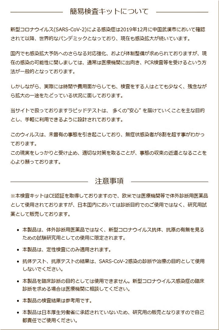 本製品は、体外診断用医薬品ではなく、新型コロナウイルス抗体、抗原の有無を見るための試験研究用としての使用に限定されます。