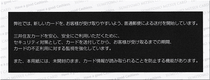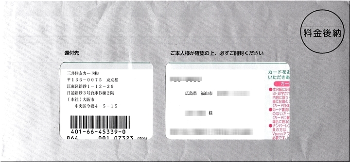 差出人は「三井住友カード梶vsanですから、中身はクレジットカードと一目瞭然ですけど、普通郵便での送付。いぶかりながら開封しますと、やはり、クレジットカードでありました。