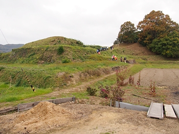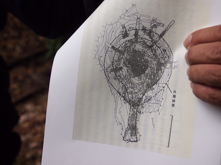 @三段に築造された墳丘。A周庭帯と周濠の存在。B陪塚(三基の方墳)の存在です。墳丘からは円筒埴輪、朝顔型埴輪、形象埴輪等が発見されています。埋葬施設については未調査です。