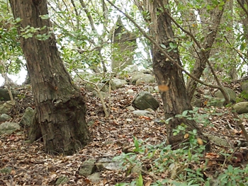 富田茶臼山古墳は南部から下ってくる尾根の先端を利用して墳丘を築造しています。通常は尾根の主軸を墳丘の主軸として築造するのですが、この古墳は尾根の主軸と墳丘の主軸が直交しています。古墳の側面(北側)を意識した造りになっています。これは三基の陪塚の位置関係からも伺えます。