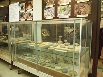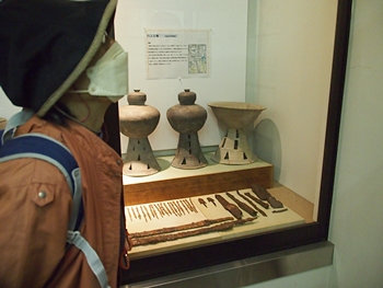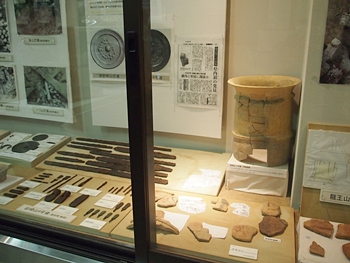 出土したものは、截頭円錐形(せっとうえんすいけい)の本体に左回りに旋回する7本の脚状の突起を付けたものです。形態的にみて頭部の径が大きく器高の低い3例と、頂部の径が小さく器高の高い5例の2種類に分類することができます。