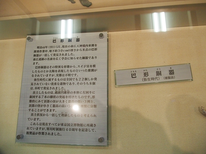 明治44年(1911)5月、現在の森広天神境内東側を開墾作業中、地下約30cmの深さから8点の巴形銅器が一括して発見されました。森広遺跡の名前を広く学会に知らせた銅器であります。