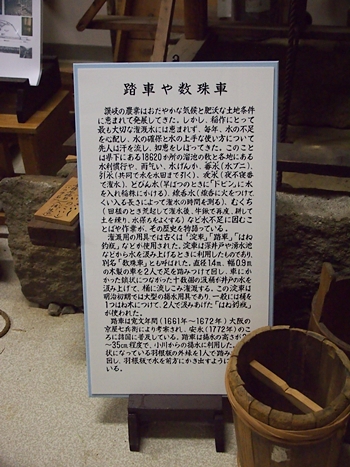 踏車は寛文年間(1661年〜1672年)大阪の京屋七兵衛により考案され、安永(1772年)のころに諸国に普及している。踏車は揚水の高さが30〜35cm程度で、小川からの揚水に利用した。階段状になっている注ェ板の外縁を1人で踏み下へ回し、注ェ板で水を前方にかき出すようにしている。