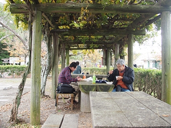 皆さん、弁当持参ですから、思い思いにみろく自然公園%烽フ適当な場所へ。GONsanは、藤棚下のテーブルへ(^-^)