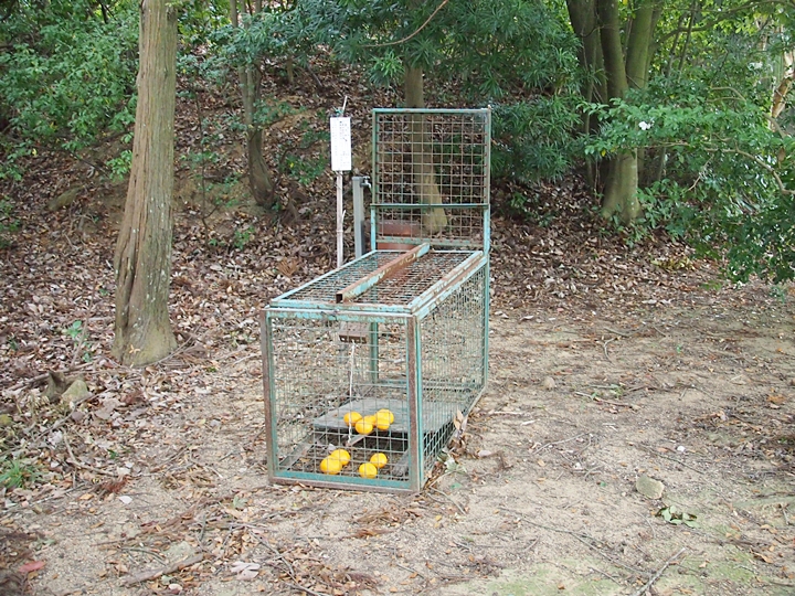 この銅像の後方には、イノシシ捕獲用の箱罠が…う〜ん、ここでもイノシシが出没しますようですネ。