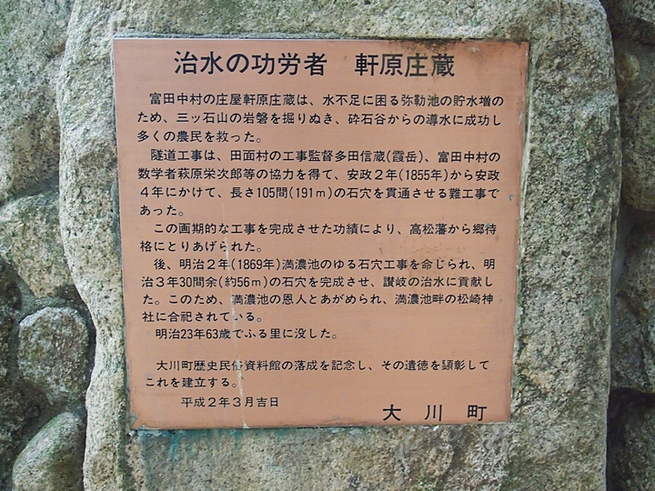 富田中村の庄屋軒原庄蔵は、水不足に困る弥勒池の貯水増のため、三ツ石山の岩盤を掘り抜き、砕石谷からの導水に成功し多くの農民を救った。