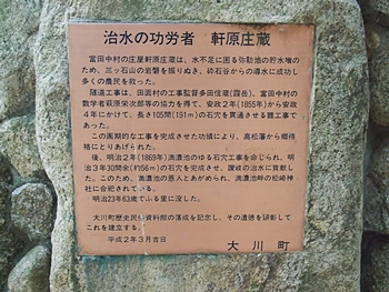 文政11年、富田中村に生まれる。当時の庄屋・軒原庄蔵は漏水甚だしい「みろく大掛井」の惨状に苦慮し、玄光谷より三ツ石に至る山底の掘り抜き導水を企画、安政2年ようやく許可を得て、東西双方より昼夜3年の掘り抜き工事を実施。庄蔵の卓越せる技術によって安政4年、105年間に及ぶ石穴が完通した。