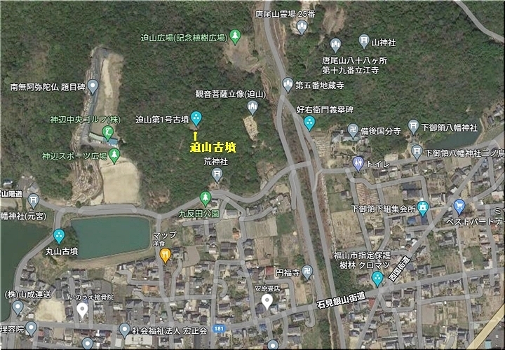 迫山古墳群は、備後国分寺の北西に広がる標高80mの丘陵頂部、東尾根、西尾根の3か所にまとまりが見られ、現在12基の横穴式石室墳が確認されている。