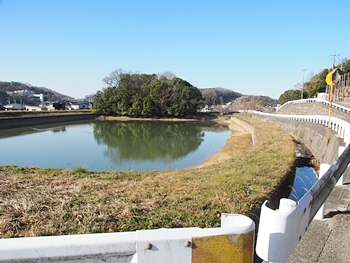 眼の前の池の西側淵に、小さな山が…この山頂に丸山古墳≠ェ有るようですから、WEB上で検索してみますと、特に古墳の画像の掲載は出て来ません。